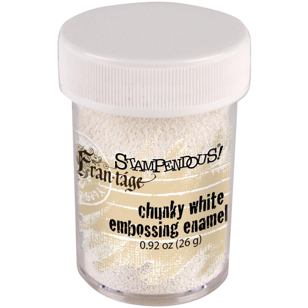 STAMPENDOUS-Deep Impressions Chunky Embossing Enamel. This chunky, vintage-inspired embossing powder will provide a thick layer of enamel to your artwork. You can impress an inked stamp into it like our Deep Impression Clear powder. Sprinkle it on your artwork and heat from beneath for a shabby chic/vintage look. This package contains one .92 ounce container of chunky white embossing enamel. Made in USA.