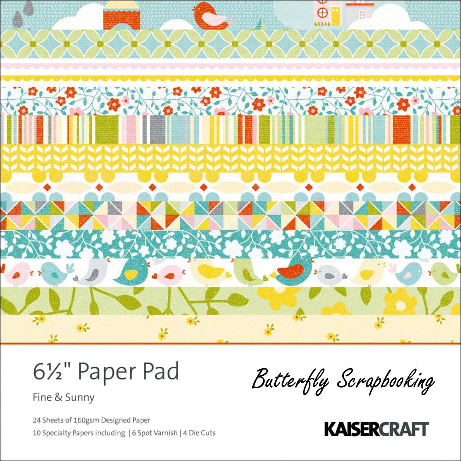 KAISERCRAFT-Fine & Sunny Collection. This is so much more than just your everyday paper pad! This package contains one 6-1/2×6-1/2 inch paper pad with forty total sheets: thirty-six sheets of single-sided scrapbook paper (two each of eighteen designs) and four sheets of assorted die-cut pieces. Six of the paper designs have special spot varnish accenting. All papers and elements are photo-friendly. Imported.